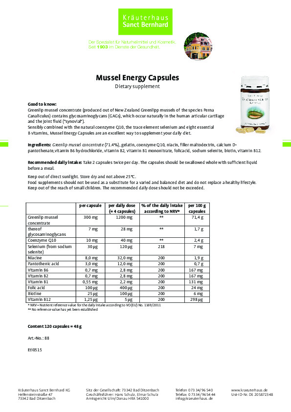 - Chiết xuất Vẹm xanh 300 mg, trong đó Glycosaminoglycan 7mg, coenzyme Q10 10 mg, selen 30 mcg, niacin 8 mg, axit pantothenic 3mg, vitamin B6 0.7 mg, vitamin B2 0.7 mg, vitamin B1 0.55 mg, acid folic 100 mcg, selen 25 mcg, biotin 1.25 mcg.