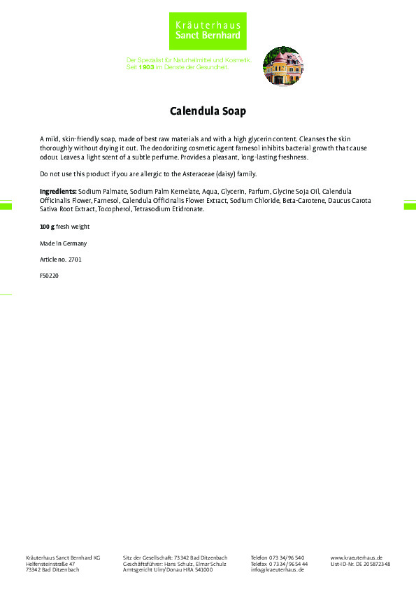 Xà phòng hoa cúc Calendula Soap với các thành phần thực vật tự nhiên như Calendula, Chamomile giúp làm sạch sâu, thanh lọc, loại bỏ bụi bẩn trên mặt và cơ thể, hỗ trợ điều chỉnh độ PH của da đồng thời có tác dụng giữ ẩm và tạo bọt cho da, rửa nhẹ nhàng mà không phá hủy lớp màng bảo vệ tự nhiên của da. Sản phẩm đã qua kiểm nghiệm, cam kết 100% hàng chính hãng thương hiệu Sanct Bernhard của Đức