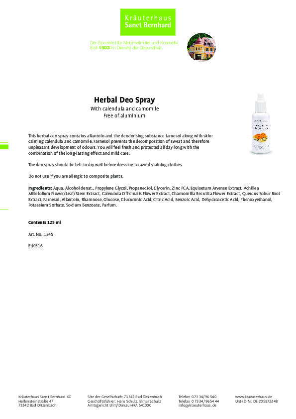 Với chiết xuất từ cúc la mã tự nhiên Xịt khoáng tinh chất cúc la mã Herbal Deo Spray là sản phẩm chăm sóc da lý tưởng, giúp tạo màn sương bảo vệ và làm dịu da, hỗ trợ cấp ẩm giúp da mịn màng, thư giãn. Sản phẩm thích hợp cho mọi làn da thậm chí da nhạy cảm, da bị mụn, trẻ sơ sinh hay người già cũng đều có thể sử dụng. Với những tia nước mát, sản phẩm sẽ nhanh chóng phủ một lớp “sương” lên da bạn, thấm cực nhanh, bổ sung độ ẩm cần thiết cho da đồng thời nuôi dưỡng và bảo vệ tốt nhất cho làn da của bạn. Sản phẩm đã qua kiểm nghiệm da liễu, cam kết 100% hàng chính hãng thương hiệu Sanct Bernhard của Đức.